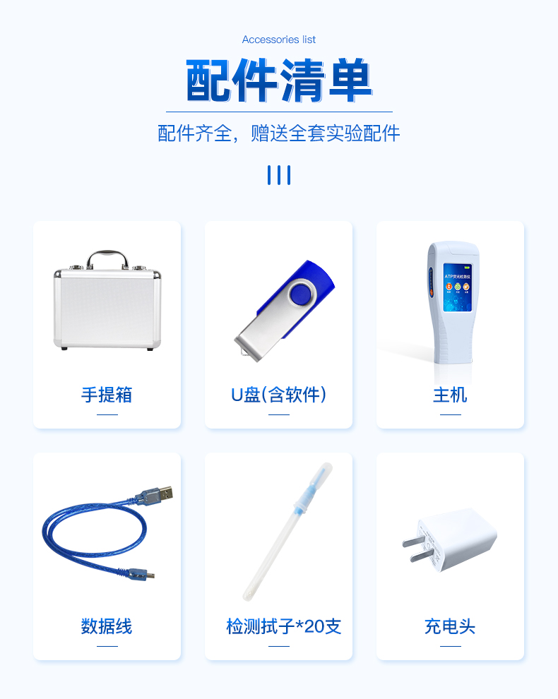 隨機(jī)配置:ATP熒光檢測儀(手持)主機(jī)、鋁合金手提箱、驅(qū)動U盤、儀器包、掛繩、PC數(shù)據(jù)線、數(shù)據(jù)分析軟件、中文操作手冊