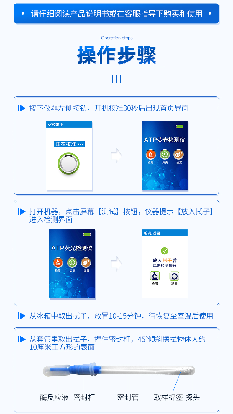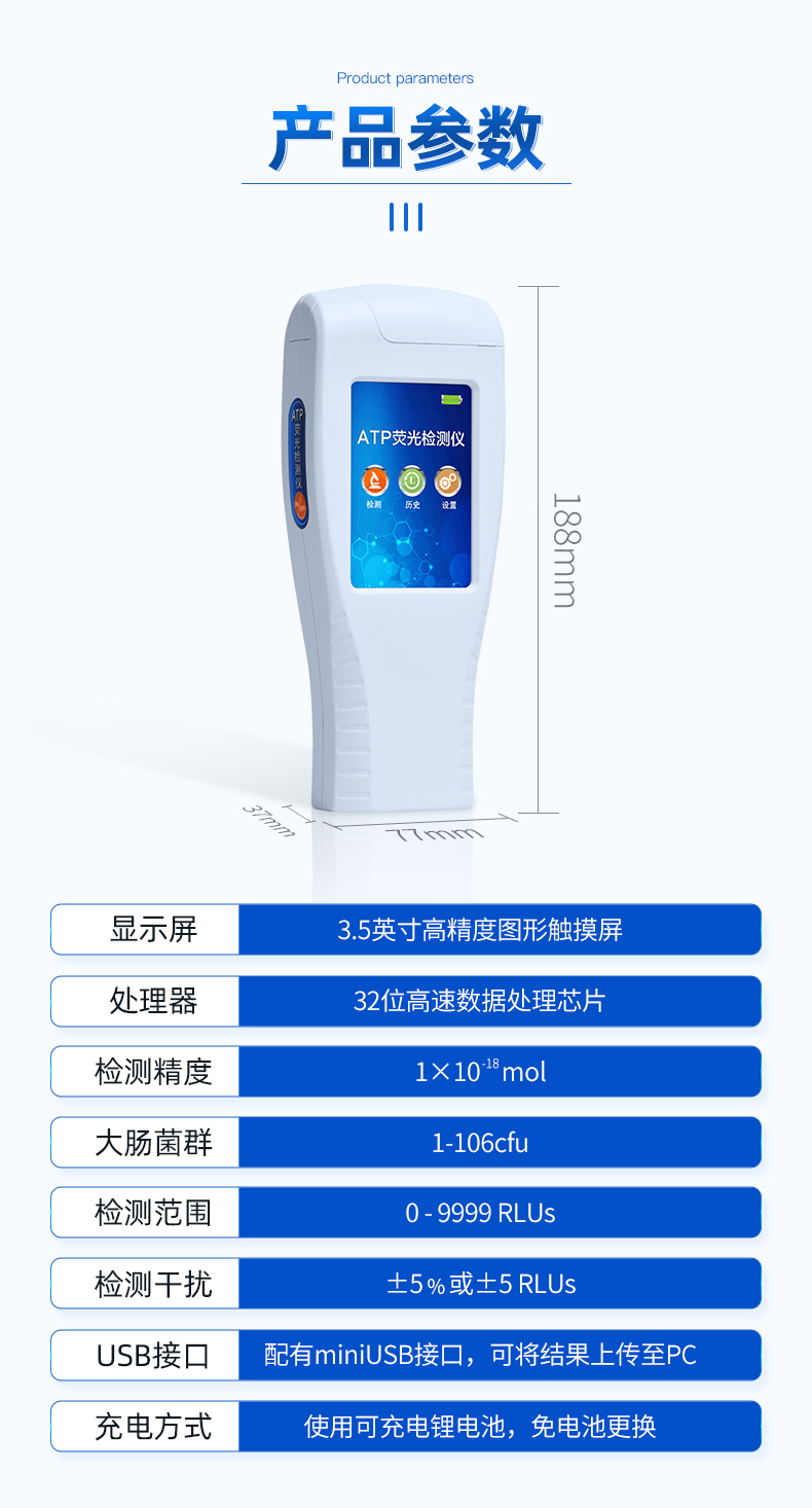 該設(shè)備為全新升級產(chǎn)品,大屏幕觸摸顯示屏,代替?zhèn)鹘y(tǒng)按鍵。操作采用生物化學(xué)反應(yīng)方法檢測ATP含量,ATP熒光檢測儀基于螢火蟲發(fā)光原理,利用“熒光素酶—熒光素體系”快速檢測三磷酸腺苷(ATP)。ATP拭子含有可以裂解細(xì)胞膜的試劑,能將細(xì)胞內(nèi)ATP釋放出來,與試劑中含有的特異性酶發(fā)生反應(yīng),產(chǎn)生光,再用熒光照度計檢測發(fā)光值,微生物的數(shù)量與發(fā)光值成正比,由于所有生物活細(xì)胞中含有恒量的ATP,所以ATP含量可以清晰地表明樣品中微生物與其他生物殘余的多少,用于判斷衛(wèi)生狀況。