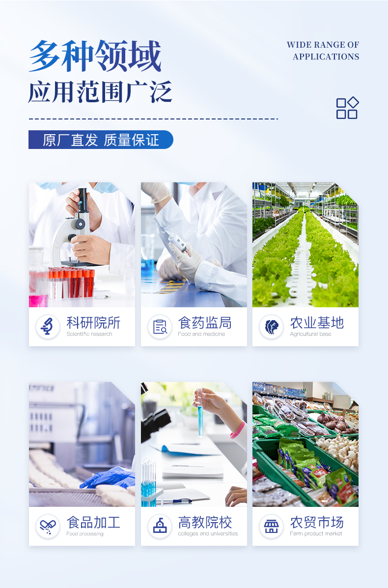 廣泛應用于主要用于蔬菜、水果、茶葉、糧食、農副產(chǎn)品等食品中有機磷和氨基甲酸酯類農藥殘留的快速檢測;此外還可用于果蔬茶生產(chǎn)基地和農貿批發(fā)銷售市場現(xiàn)場檢測,餐館、學校、食堂、家庭果蔬加工前的安全速測等。
