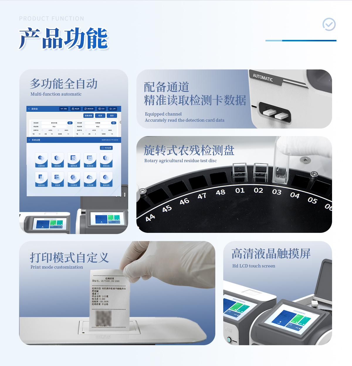 | 1. 試劑位置:3個 | 2. 農殘檢測盤:旋轉24通道比色盤,可任意選擇檢測通道,自動對應選擇通道。 | 3. 膠體金通道:2個,可讀取檢測卡結果,自動采集、處理分析,自動判斷檢測結果,并具備自動判空功能。 | 4.系統(tǒng)配置:10.1寸高清液晶觸摸屏,采用ARM Cortex?-A7,RK3288/4核處理器,運行內存1GB。Android7.1.1 系統(tǒng)分辨率1280×800。 | 5.恒溫系統(tǒng):具有自動加溫溫控系統(tǒng),精準恒溫37℃,精度±0.1℃。 | 6.添加系統(tǒng):儀器按照試劑要求自動、按時、按量加入試劑,并且自動對未正常放置的樣本或異常的樣本進行檢查并提示。 | 7.清洗功能:儀器具備回流及自動清洗管路功能,避免試劑污染。 | 8.混勻功能:設備具備自動混勻功能。 | 9.光源校準:設備可自動校準,確保檢測準確度。 | 10.實時監(jiān)控:儀器測試過程中屏幕顯示運行狀態(tài),可實時查看。 | 11.數(shù)據存儲:內部存儲16GB,可存儲500萬條數(shù)據。 | 12.樣品多選功能:設備具備樣品一鍵多選功能,選擇樣品自動匹配檢測通道。 | 13.項目預設:可提前設置單個及多個相同或不相同的檢測任務,可單次或者多次調取,減少檢測時間。 | 14.自定義打印系統(tǒng):內置自定義打印系統(tǒng),可按需靈活設置開啟或關閉:產品合格證(國家農業(yè)部標準),二維碼,抽樣信息、檢測信息,受檢信息等信息的打印。 | 15.A4版本報告打印功能:設備可自動生成A4版報告,A4報告帶二維碼,可掃描二維碼生成電子版,并可識別真?zhèn)巍?/td> | 16.傳輸方式:儀器配備無線通信模塊: 4G(APN)通訊模塊、Wifi模塊,藍牙傳輸模塊,同時具有USB接口以及RJ45接口能以多種方式實現(xiàn)數(shù)據保存和數(shù)據傳輸功能,設備數(shù)據可以同步上傳至平臺。 | 17.系統(tǒng)17.數(shù)據監(jiān)管系統(tǒng):設備自帶監(jiān)管平臺,并可同步對接監(jiān)管平臺,數(shù)據可局域網和互聯(lián)網數(shù)據上傳,檢測結果可直接傳至食品安全監(jiān)管平臺。達到食品安全問題預估、預警。 | 18.系統(tǒng)遠程更新功能:無需設備返廠,即可遠程實時升級全新系統(tǒng),節(jié)省時間成本及避免運輸造成設備損。 |
