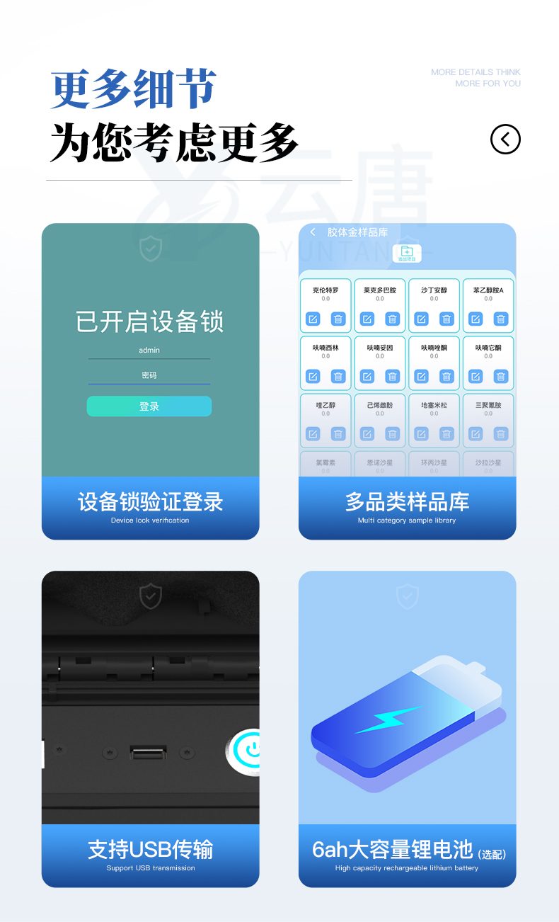先咨詢優(yōu)惠福利,再購買,價格更便宜,更實惠。 在線咨詢 技術問題山東云唐智能科技有限公司生產(chǎn)的高智能食品安全檢測儀可快速檢測200多種食品安全項目,包含非食用化學物質(zhì)、濫用食品添加劑、農(nóng)藥殘留、獸藥殘留、重金屬、病害肉、營養(yǎng)強化劑、抗生素類殘留、激素類殘留、真菌毒素類殘留、化學類殘留等項目的定性定量檢測。