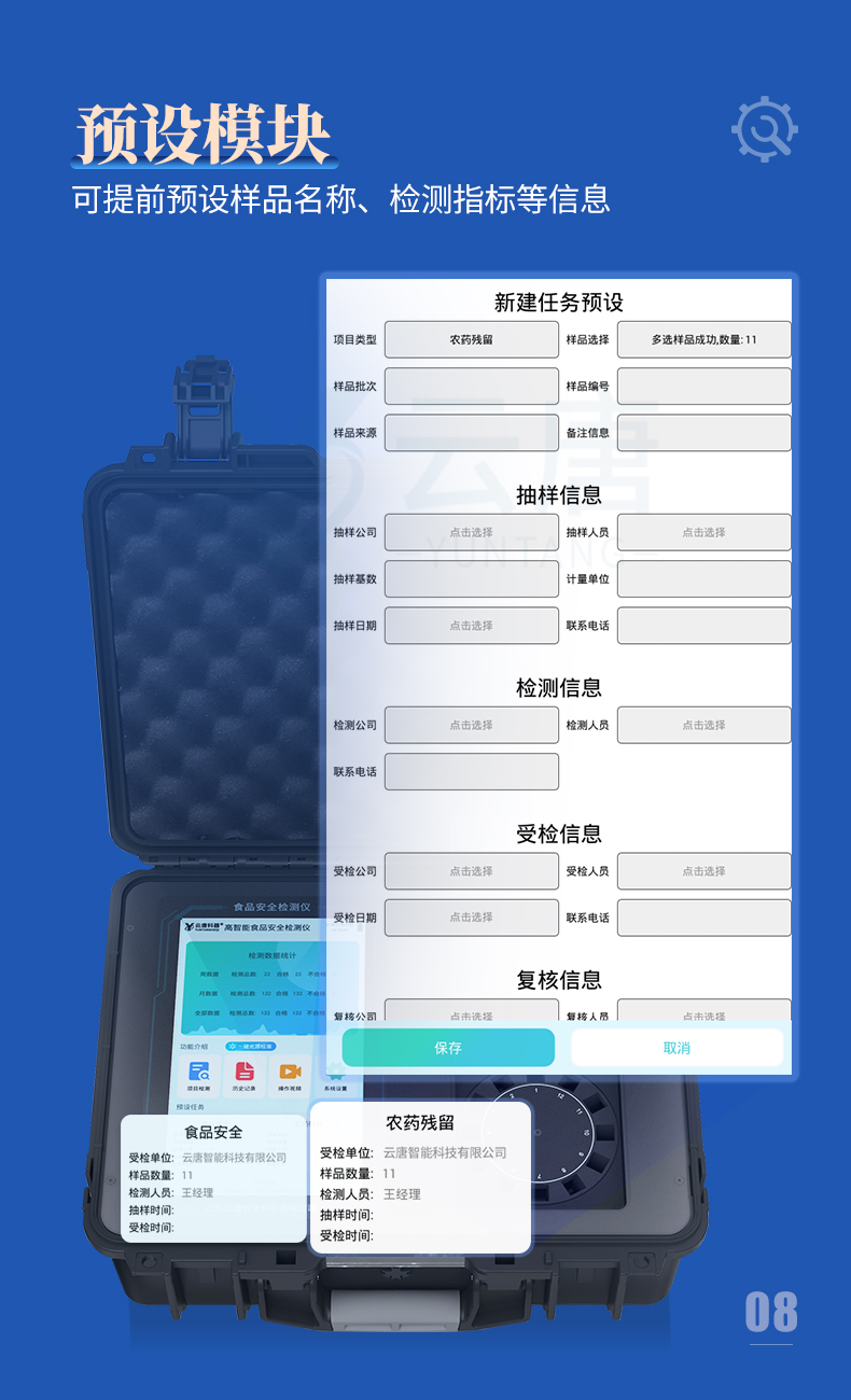 *6、儀器具有任務預設模塊,可在樣品送檢前提前預設樣品名稱、檢測指標、送檢單位等信息,樣品送檢時一鍵調(diào)取保存信息,檢測更加方便快捷。