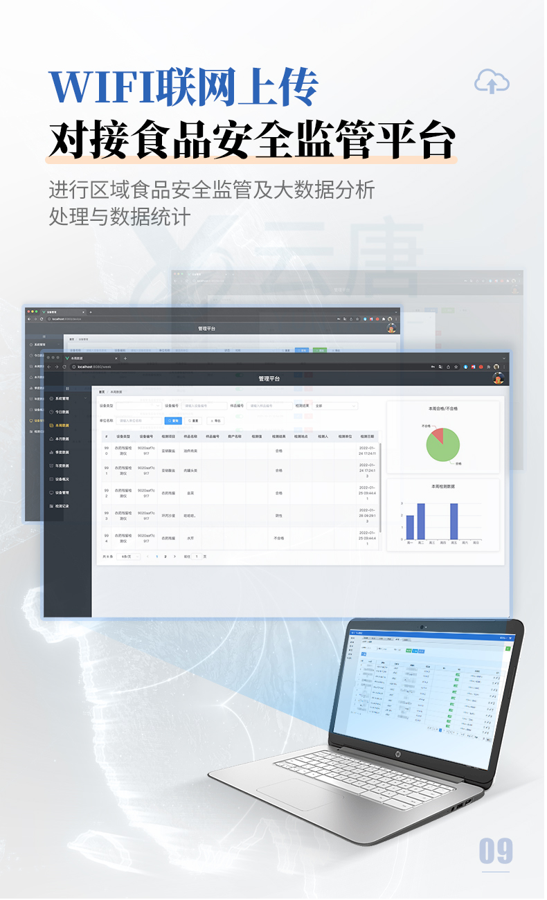 12、儀器具有 wifi 聯(lián)網(wǎng)上傳、RJ45網(wǎng)線連接功能,可以快速上傳數(shù)據(jù)。同步對接監(jiān)管平臺,數(shù)據(jù)可局域網(wǎng)和互聯(lián)網(wǎng)數(shù)據(jù)上傳,檢測結(jié)果直接傳至食品安全監(jiān)管平臺。進行區(qū)域食品安全監(jiān)管及大數(shù)據(jù)分析處理與數(shù)據(jù)統(tǒng)計,檢測區(qū)域食品安全長短期動態(tài),達到食品安全問題預估、預警。