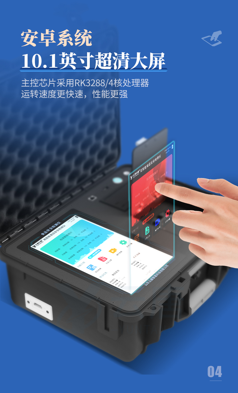 食品安全檢測儀器設備采用10.1英寸液晶觸摸屏顯,搭配運行安卓智能操作系統(tǒng),主控芯片采用ARM Cortex-A7,RK3288/4核處理器,主頻··· 熱線:133-7109-8225