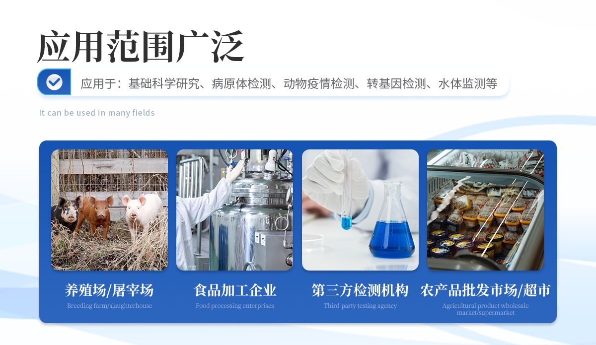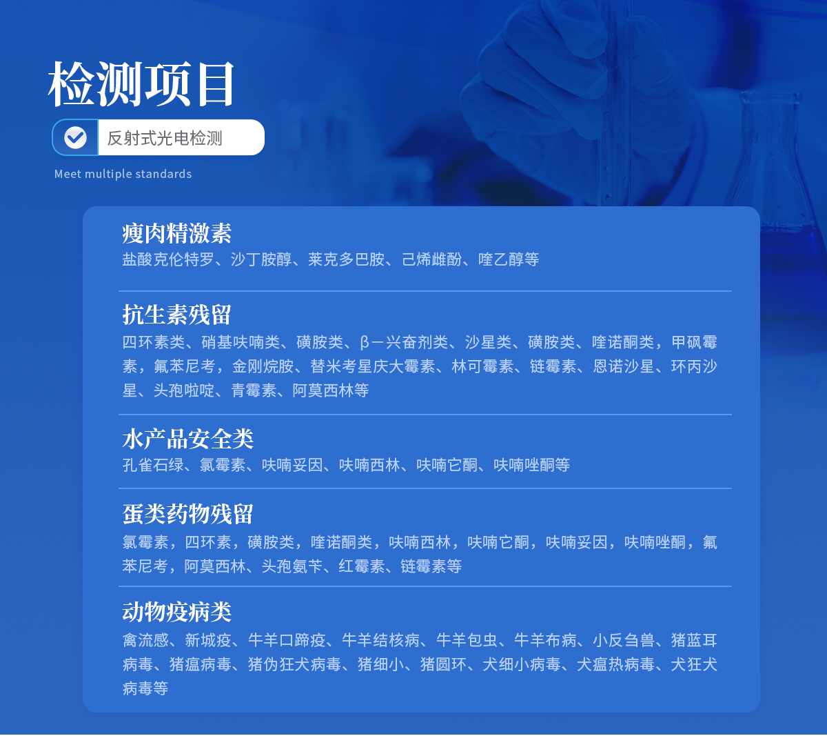 | 瘦肉精激素:鹽酸克倫特羅、沙丁胺醇、萊克多巴胺、己烯雌酚、喹乙醇等 | 抗生素殘留:四環(huán)素類(lèi)、硝基呋喃類(lèi)、磺胺類(lèi)、β-興奮劑類(lèi)、沙星類(lèi)、磺胺類(lèi)、喹諾酮類(lèi),甲砜霉素,氟苯尼考,金剛烷胺、替米考星、慶大霉素、林可霉素、鏈霉素、恩諾沙星、環(huán)丙沙星、頭孢啦啶、青霉素、阿莫西林等 | 水產(chǎn)品安全類(lèi):孔雀石綠、氯霉素、呋喃妥因、呋喃西林、呋喃它酮、呋喃唑酮等 | 蛋類(lèi)藥物殘留 氯霉素,四環(huán)素,磺胺類(lèi),喹諾酮類(lèi),呋喃西林,呋喃它酮,呋喃妥因,呋喃唑酮,氟苯尼考,阿莫西林、頭孢氨芐、紅霉素、鏈霉素等 | 動(dòng)物疫病類(lèi):禽流感、新城疫、牛羊口蹄疫、牛羊結(jié)核病、牛羊包蟲(chóng)、牛羊布病、小反芻獸、豬藍(lán)耳病毒、豬瘟病毒、豬偽狂犬病毒、豬細(xì)小、豬圓環(huán)、犬細(xì)小病毒、犬瘟熱病毒、犬狂犬病毒等 |