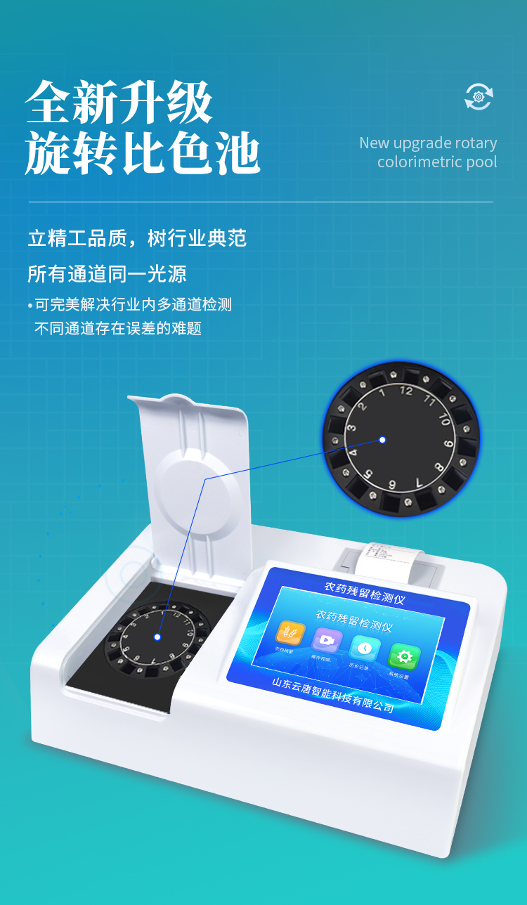 山東云唐智能科技有限公司生產(chǎn)的農(nóng)藥殘留檢測儀廣泛應用于主要用于蔬菜、水果、茶葉、糧食、農(nóng)副產(chǎn)品等食品中農(nóng)藥殘留的快速檢測,依據(jù)國標GB/T5009.199-2003進行檢測,適用于果蔬茶生產(chǎn)基地以及農(nóng)貿(mào)批發(fā)銷售市場現(xiàn)場檢測,餐館、學校、食堂、家庭果蔬加工前的安全速測等。