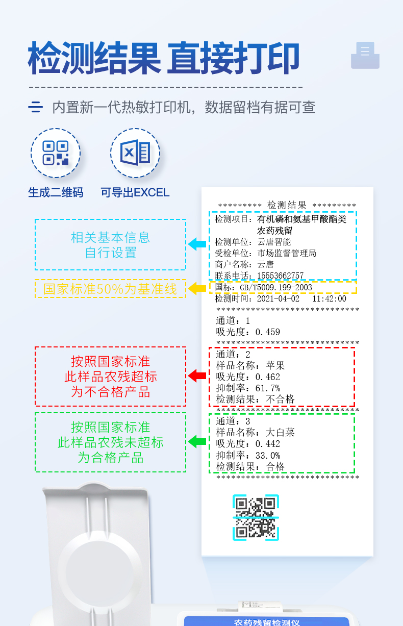8、新一代高速打印機(jī),可同時打印二維碼,打印格式為檢測人姓名、吸光度差值、檢測時間、檢測機(jī)構(gòu)、樣品名稱及結(jié)果判定。