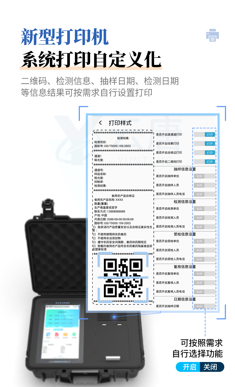 *10、系統(tǒng)打印自定義化,打印格式多樣化,產(chǎn)品合格證(國家標準要求),二維碼,抽樣信息、檢測信息,受檢信息、復核信息、抽樣日期、檢測日期等信息結(jié)果,可按需求自行設置打印。