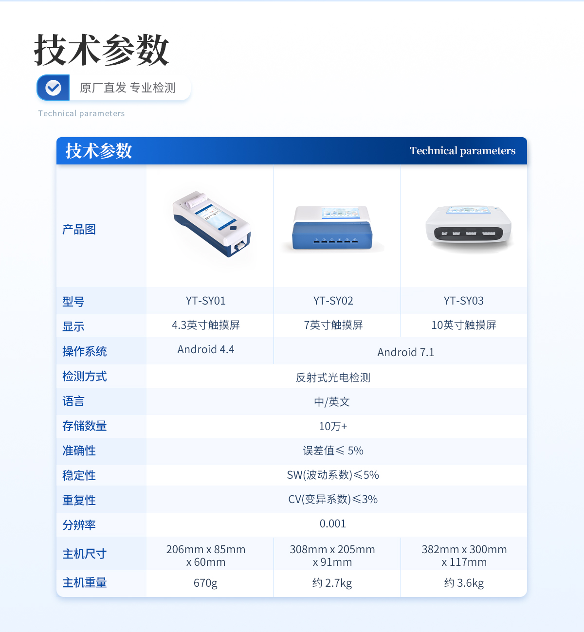 | 1、 10.1英寸電容式觸摸屏,分辨率:1280:x:800,內(nèi)部存儲(chǔ):1+8GB | 2、 操作系統(tǒng):Android:7.1 | 3、 檢測(cè)方式:反射式光電檢測(cè) | 4、 語(yǔ)言:中/英文: | 5、 存儲(chǔ)數(shù)量:10萬(wàn)+ | 6、 準(zhǔn)確性:誤差值≤:5% | 7、 穩(wěn)定性:SW(波動(dòng)系數(shù))≤5% | 8、 重復(fù)性:CV(變異系數(shù))≤3% | 9、 分辨率:0.001 | 10、★通道:1個(gè)單卡卡槽(70mm*20mm*5.6mm);1個(gè)二聯(lián)卡卡槽(70mm*28mm*5.6mm);1個(gè)三聯(lián)卡卡槽(70mm*40mm*5.6mm);1個(gè)四聯(lián)卡卡槽(70mm*50mm*5.6mm) | 11、檢測(cè)時(shí)間:<:5秒:(單卡及多聯(lián)卡);可對(duì)樣本進(jìn)行膠體金定性> | 12、打印機(jī):熱敏打印機(jī)(熱敏打印紙:57*30mm) | 13、數(shù)據(jù)傳輸:WiFi、藍(lán)牙、USB、射頻讀卡、外置掃碼模塊(選配) | 14、數(shù)據(jù)處理:可通過(guò)通訊端口進(jìn)行數(shù)據(jù)匯總、上傳監(jiān)管平臺(tái)等 | 15、檢測(cè)通道孵育檢測(cè)一體,溫度范圍::室溫:+5℃:~:60℃ | 16、接口:USB接口:2個(gè);USB-B接口:1個(gè);LAN接口:1個(gè):;DC電源接口:5.5/2.1mm | 17、電源:輸入:AC:220V:±:20V,:50Hz:±:1Hz;輸出:DC:12V,:5A | 18、使用環(huán)境:溫度:0~50℃;濕度:0~90%: | 19、主機(jī)尺寸::382mm:x:300mm:x:117mm | 20、主機(jī)重量:約:3.6kg |