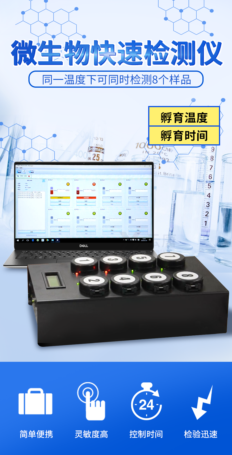 4) 檢測樣本只需1ml/1g;同一溫度下可同時檢測8個樣品;
